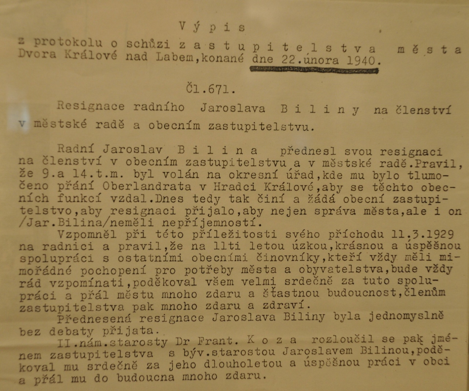 Jaroslav Bilina32 zápis o odstoupení starosty Biliny z funkce na nátlak Němců, 22. února 1940.JPG