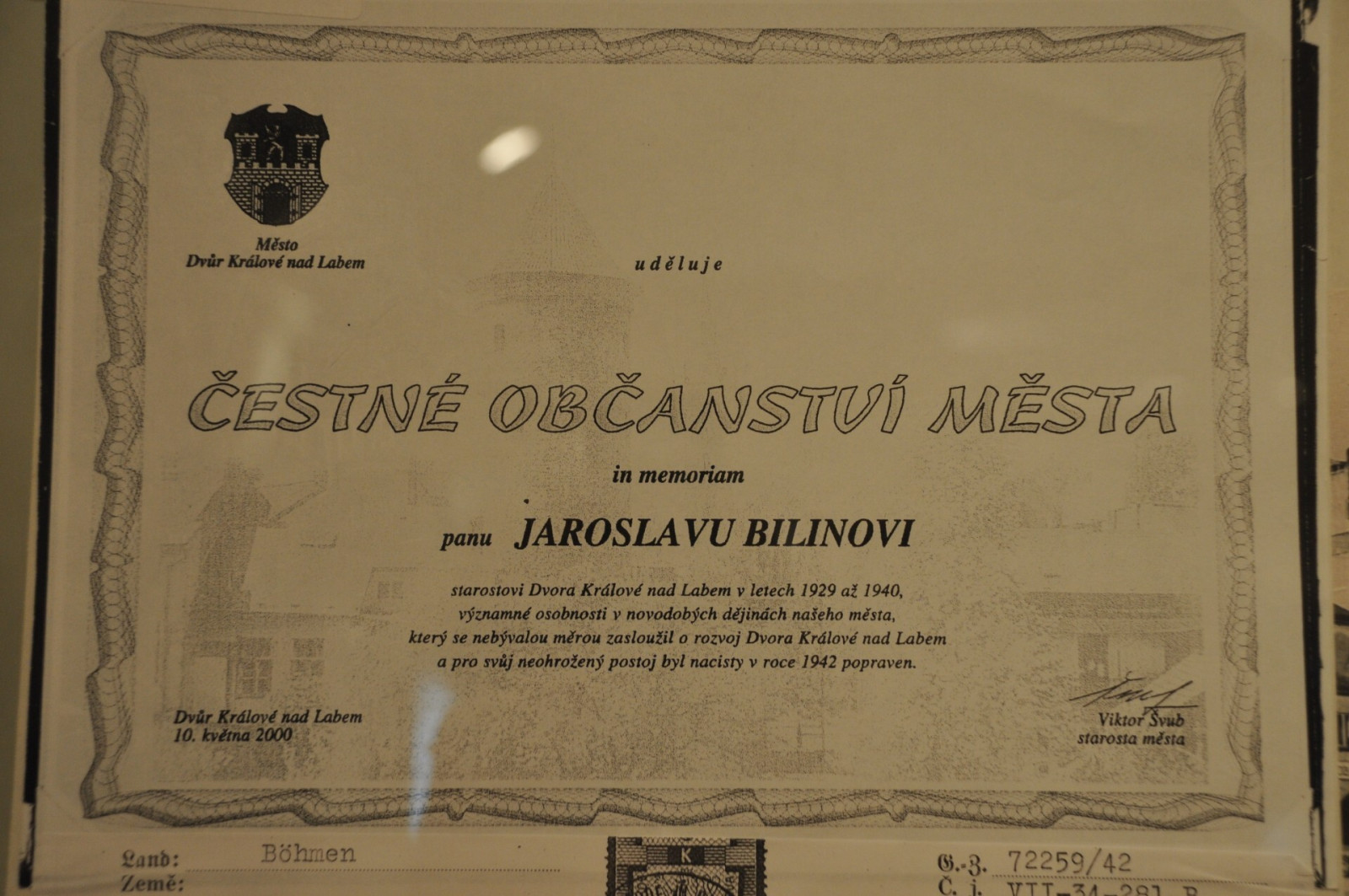 Jaroslav Bilina36 Udělení čestného občanství bývalému starostovi města J. Bilinovi im memoriam v roce 2000.JPG